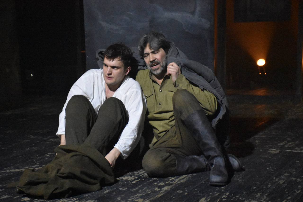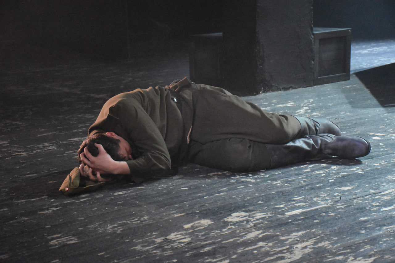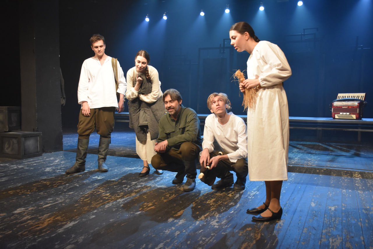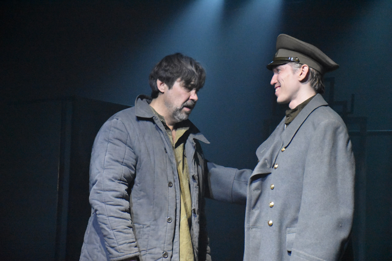 В постановке заняты всего пять артистов. Основная часть многоголосицы персонажей доверена Сергею Ванину (молодой Соколов, комендант концлагеря, немец, сын Анатолий) и Илье Ульянчеву (командир автороты, полковник Красной Армии, военврач, расстрелянный богомолец и другие). Им приходится демонстрировать мастерство перевоплощения, порой кардинального. На эпизодические роли наверняка можно было пригласить и других артистов. Однако кажется очевидным, что выбор в пользу небольшого количества исполнителей был сделан намеренно. Каждый герой постановки – это не столько отдельный, сколько собирательный образ. Каждый из них является носителем русского характера, о котором и писал Шолохов. Исходя из этого, исполнение роли коменданта концлагеря Ваниным и Ульянчевым оказывается неизбежной театральной условностью.
