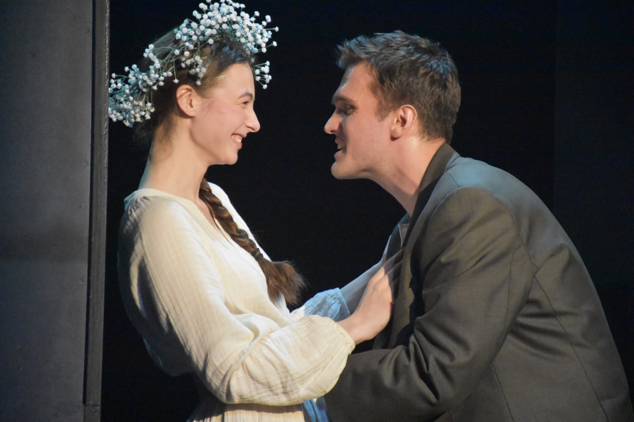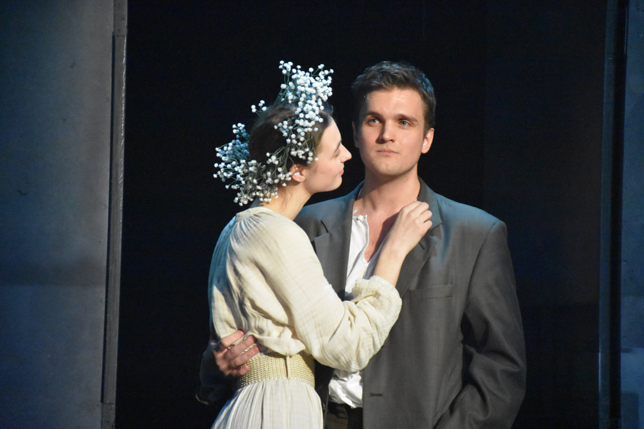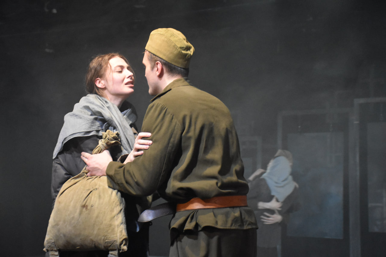 С ролью жены Соколова Ирины удачно справилась Марина Абраменко. Интересно наблюдать за их взаимодействием с Сергеем Ваниным (этот дуэт знаком зрителям по спектаклю «Снег», который также посвящен войне). Нежность и искренняя взаимная любовь читается во взглядах и прикосновениях. Однако чувство умиротворения быстро сменяется страхом: начинается война. Соколов смело и мужественно принимает обстоятельства, отправляясь защищать Родину. Сцена проводов Соколова на фронт ощущается мучительно беспокойно. Под воздействием эмоций он в последний момент вырывается из объятий жены и отталкивает ее, о чем потом будет жалеть всю жизнь. Ирина же понимает, что они больше никогда не увидятся.